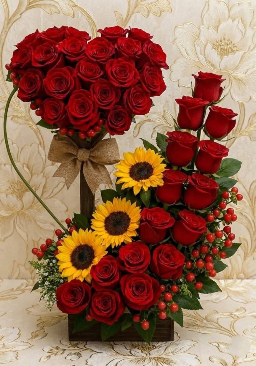 An elegant floral arrangement featuring many red roses forming a heart at the top, accompanied by additional roses, yellow sunflowers, and small red berries on a decorative base.